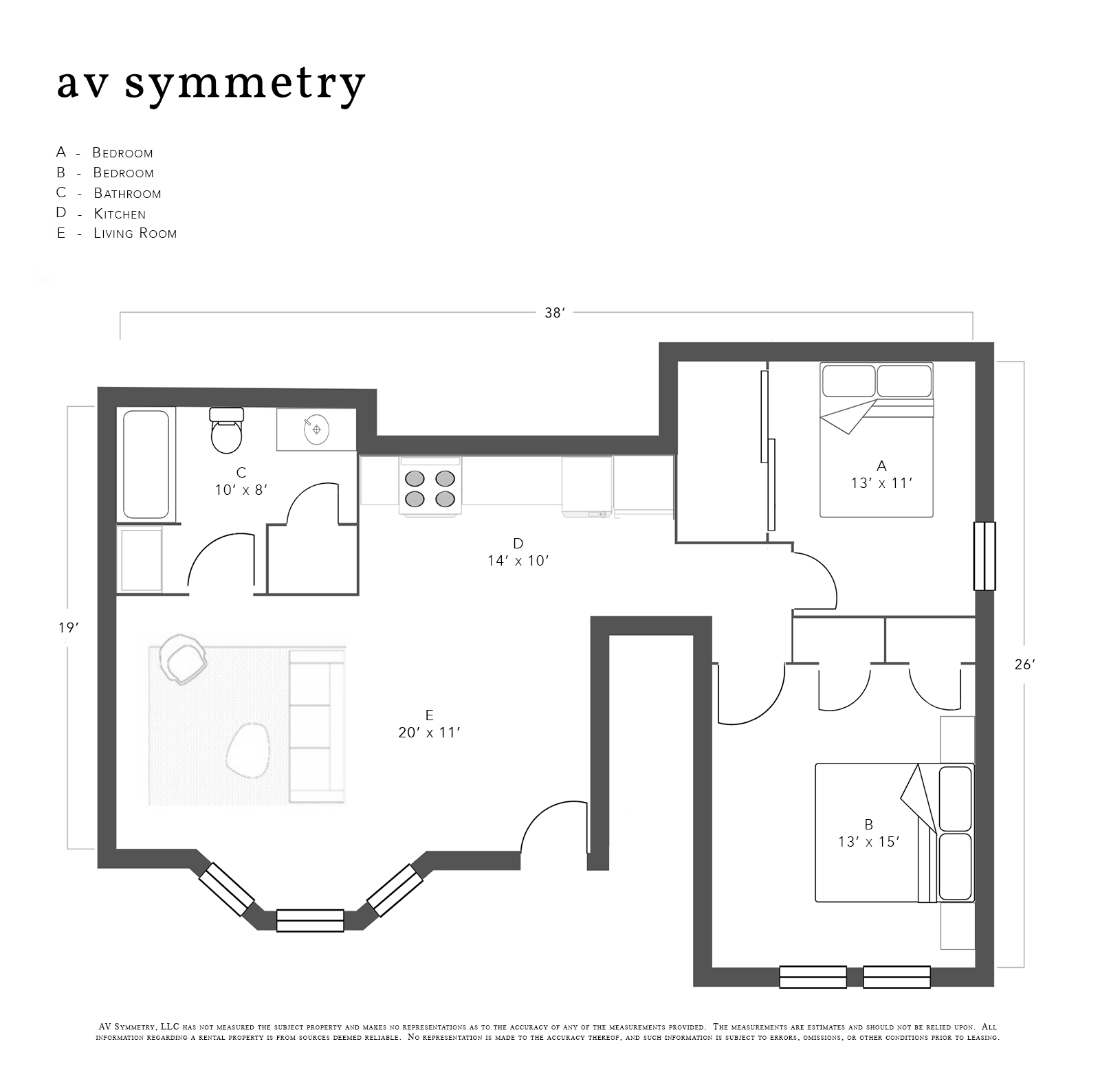 Two generously sized bedrooms measuring 13' x 11', 13' x 15' .